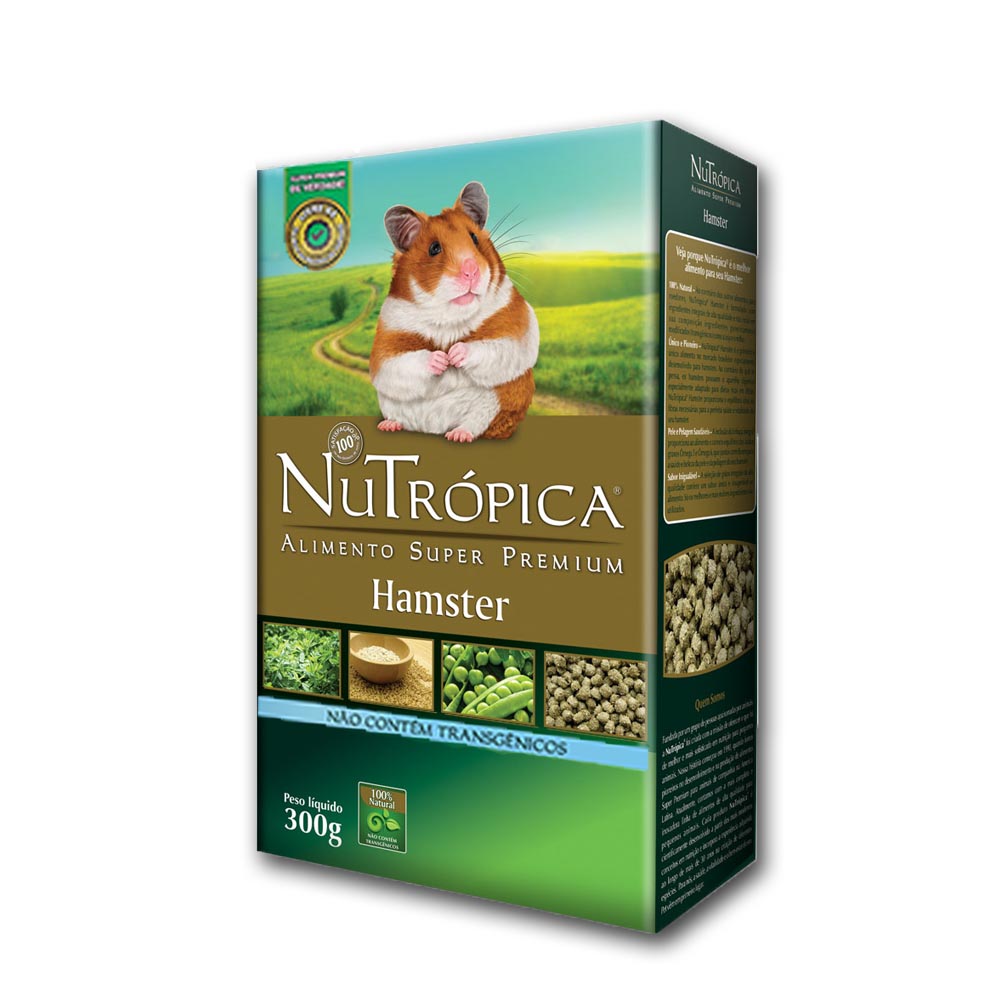 NuTrópica® Hamster é um alimento extrusado completo, cientificamente formulado e especialmente desenvolvido para hamsters e pequenos roedores. Cada embalagem de NuTrópica® Hamster contém uma combinação exclusiva das mais nobres e saborosas matérias-primas não transgênicas, preparadas sob rigoroso controle de qualidade e utiliza as melhores técnicas em produção de alimentos. São mais de 30 ingredientes diferentes, incluindo alfafa e vários tipos de grãos integrais como aveia, trigo, linhaça e ervilha, que juntos proporcionam os níveis ideais dos nutrientes necessários para a perfeita saúde, bem-estar e vitalidade do seu hamster. Por ser um alimento não transgênico, NuTrópica® Hamster não utiliza milho nem soja em sua formulação.